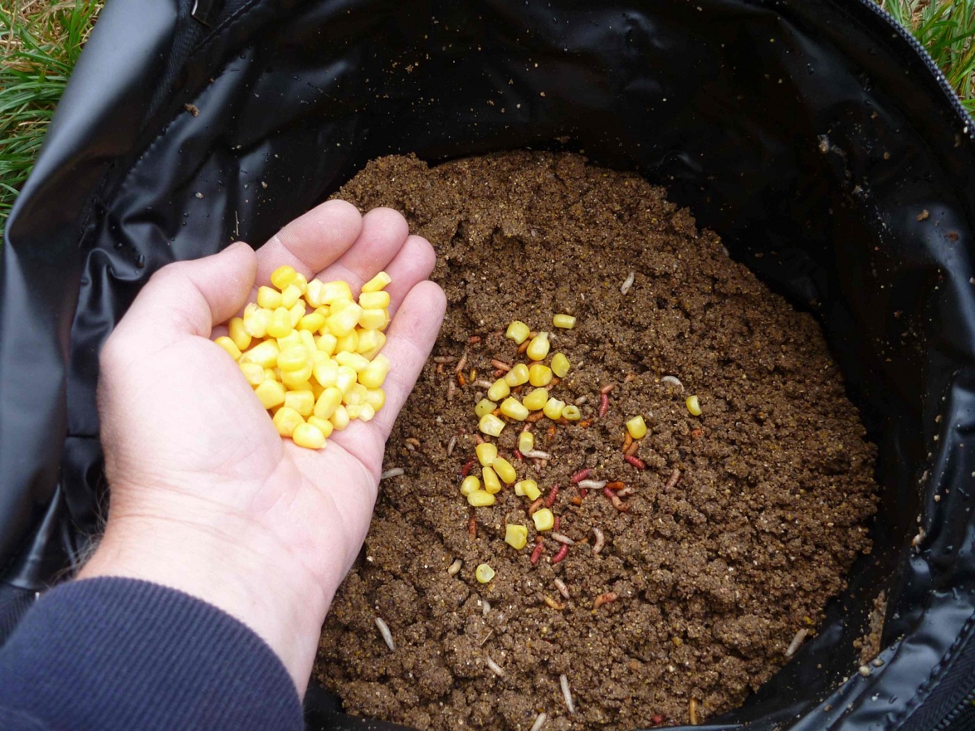 Jednodušší je koupit si v rybářských potřebách na určitou vodu dva - tři hotové pytlíky, u vody je smíchat, případně doplnit určitým komponentem(pražené konopí, grilované coco belge,mletá řepka, ttx, anglická vločka, perník,oříšek..) přidat posilovač podle druhu ryb, jaké chci chytat ( vanilka, jahoda, halibut, cejn, ..) a vše řádně promíchat. Potom přidat hlínu (jednak krmení obarví, jednak je zatíží a ve vodě se uvolňuje a tím dělá mrak a láká ryby a jednak přinutí ryby vyzobávat v hromádce krmení živou složku) vše dobře promíchat, navlhčit '(raději vícekrát méně, než krmení "utopit") a v každém případě krmení případně přetáhnout přes síto, a tím si vytvořit tu správnou strukturu. S vlhčením a vodou velmi opatrně, většina krmení hodně saje, raději na několikrát.