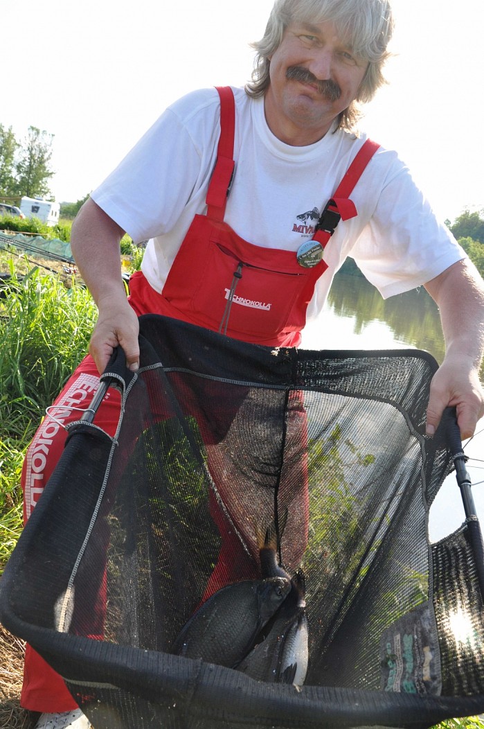 Druhý den to už od rána vypadalo na pěkný pařák, což se taky potvrdilo. Vstávali jsme poměrně brzy, nasnídali se a už zase obvyklý kolotoč. Namíchat krmení, ošetřit živou a je tu los. Opět losuje Míra a posílá Karla na A10, mě na D1 a sebe na F1. Rozhlížím se kolem sebe v sektoru a koukám, že jsme se tu sešli tři včerejší jedničkáři, na D2 je Jirka Vitásek a na D3 Michal Řehoř, dále vidím Milana Štěpničku na D5, vedle něj na D4 Pavel Krýsl...no to bude slušný boj. Sluníčko mi nepříjemně pere do zad a nebýt Mirdy, asi bych se spálil, protože mě poctivě maže. Opět nenechávám nic náhodě a připravuji si svoje profíčky, navíc mám ještě jednu tajnou zbraň - testuji proutek 420 a jsem na něj hodně zvědavý. Než jsem protahal všechna očka a připravil se, je tu pískání a začínáme. Opět jdu asi ze všech nejdál a po patnácti minutách mi to opravdu sedlo, protože mi jde ryba na hod. Je to nádherný, asi hodinu a půl trvající koncert, který mi bohužel přerušila loď, která proplula a je po záběrech. Půl hodiny se trápím a vidím, že ryba sjela hodně dolů, protože se chytá asi deset míst pode mnou. Zkouším všechno možné, měním nástrahy, až mě napadlo sáhnout o kousek za krmené místo, poslat tam pár lepeňáků a záběr, mrmlák. Konečně jsem zase ve hře, i když nade mnou vidím Milana, jak páčí mrmláka za mrlákem. Mirda, který nám dělá břeh, mě chlácholí, že na moje tři - čtyři ryby on má jednu větší, a že to stačí, ale nějak tomu nevěřím. No nic, ještě jsou ve hře oba jedničkáři, tak se uvidí. Bojuji tak o trojku, čtyřku. Milan páčí dalšího mrmláka, což mě moc na klidu nepřidává, ale držím svoji lajnu a tahám menší ryby, ale více. Čtvrt hodinky před koncem tahám jednoho slušnějšího mrmláka, což v tom proudu s těžkým olovem není nic moc, ale daří se mi. Neztratil jsem ani jednu rybu a neprošvihl ani jediný záběr. A je tu konec a jde váha zrovna ode mě nahoru. Vážím 9740g a netrpělivě očekávám, kdo mě sestřelil. Milan dělá 8420g, Michal 5180g a Jirka 3400g, takže jsem udělal druhou jedničku!! Je to paráda, Karel přidal z "antiforhontu" na áčku dvojku s váhou 6440g a Míra z "opět z antiforhontu" na efku druhou dvojku s váhou 2220g.