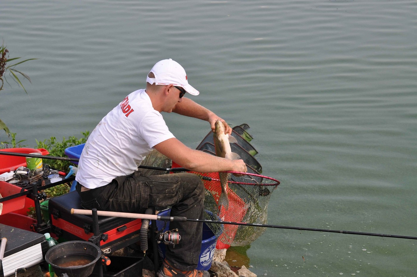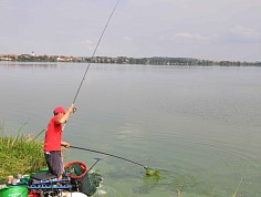 Náš tým ve složení Karel Skalický, Honza Ouřeníček, Jiří Ouředníček a nesmírně důležitý Míra Stejskal na břehu(ještě jednou mu děkuji, protože dokázal vždy v pravou chvíli přinést ty správné informace) si vylosoval: Karel D9, Honza F5 a já B9, což nebyl žádný perfektní los, ale ani propadák a asi nejhorší pozici měl Honza, protože sektor "ef" byl od začátku skoro celý zavátý zeleným kobercem a místama nešlo ani prohodit krmítko. Taktika byla jasná, na začátku hodně nakrmit a chytat dál, než soupeři. Jak jsem tak sledoval, byli mezi námi jedinci, kteří to pálili přes sedmdesát metrů a to není žádná sranda v protivětru být přesný. Naštěstí kolem mě kromě Jakuba Šabaty, který pálil asi nejdál ze všech, ostatní soupeři chytali tak někde na hranici padesáti až pětapadesáti metrů, tak jsem klipnul šedesát tři metry a poslal tam na začátek zhruba třicet krmítek. Postavil jsem Míru doprostřed sektoru a řekl mu, že budu krmit tak dlouho, než uvidí první chycenou rybu.