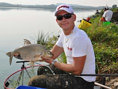 Chytal jsem svoje třistadevadesátky profíky a neměl s náhozel do dálky vůbec žádné problémy. Díky docela přesnému zákrmu jsem měl záběr od ryby tak do dvou - tří minut a najeli mě krásní cejni. Ze začátku jsem je chytal na dva až tři červíky, později už byli mlsní a chtěli změnu, tak jsem střídal pinky, kukly, žížaly a patentky. Zkoušel jsem průběžku i pátera a po pravdě záběr jsem měl na oboje, ale průběžka se díky velkému švihu do dálky tak po třech - čtyřech hodech slušně motala, zatímco páter jsem nezamotal ani jednou a tak jsem celý závod odchytal v klidu na pátera. První půlku závodu byly záběry poctivé hokejky nebo vracáky, ale s postupem času ryby byly opatrnější a záběry i díky zelenému nabalenému "šlemu" byly hůře znatelné, dokonce jsem jeden čas musel stále povolovat vlasec, aby ryba necítila žádný odpor a já viděl i nepatrné zachvění. Záběry jsem měl poctivé čtyři hodiny, potom ryby odjely a vrátily se až patnáct minut do konce, kdy jsem zdolal ještě tři skoro kilové cejny a vážil jsem 23720g a dělal na takovou váhu až čtyřiapůlku (úplně stejnou váhu měl Jirka Ludvík), protože ve dvacetičtyřech kilech jsme byli ještě další tři, kdy rozhodovala opravdu jedna malá rybička, jen nám utekl Jakub s váhou 33200g.