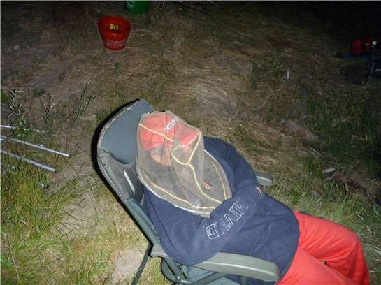 Pasáž, kde bych popisoval, jak jsme se těšili na záběr, jak jsme stále čekali, míchali,krmili a zase čekali a zase krmili a tak stále dokola raději vynechám, takže přišla noc a pořád v nás doutnala naděje, že teď to konečně přijde...Ale stále nic. Jen začali pořádně kousat komáři a tiplice a já nevím,jak se ještě jmenují ti krvežrouti...Míra nad nimi vyzrál a vymyslel perfektní protikomáří úpravu.
