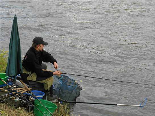 V přípravě jsem si proplaval a protahal sektor a zjistil jsem, že budu chytat asi na svých klasických 22metrech, kde šedesátka krmítko jen tak tak sedí. Pár minut před krmením stříhám žížaly do krmení a připravuji si asi 15 základních koulí na zakrmení. Jaké je moje překvapení, když všichni tři soupeři pode mnou krmí minimálně o sedm až deset metrů dál! Nenechávám se vyvést z rytmu, v klidu zakrmuji a chytám si svoji „lajnu". První hodinu jsem naprosto bez záběru a všichni tři moji soupeři pode mnou mají po dvou až třech rybách.. Díky naší spojce - Mírovi vím, že Míra má rybu a i Honzík má dvě a skoro všichni chytají slušné cejny na žížaly.