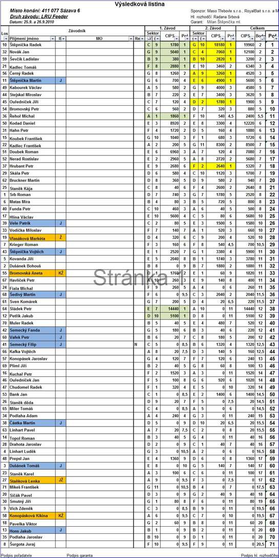 Já se snad v životě nenaučím dobře losovat a tak opět!!! tahám prostředek, C7 a z tohoto místa vydoluji, co se dá a to je nějakých 120 g a dělám na to krásnou čtyřku. Vítězí Radek, kterému přišel chvilku před koncem krásný mrmlák a šoupe ho na bednu, dvojku dělá Petr Bromovský s nějakými 560g a trojku Petr Funda s 450g. Chytalo se na pár místech na sektoru E a F, kde se sypali kapři a kdo sáhl dobře do losu, tak si pořádně zachytal. Míra Stejskal dělá na "béčku" na osm ježdíků s váhou 220g krásnou dvojku a Honza na "efku" s jednou rybou osmičku.