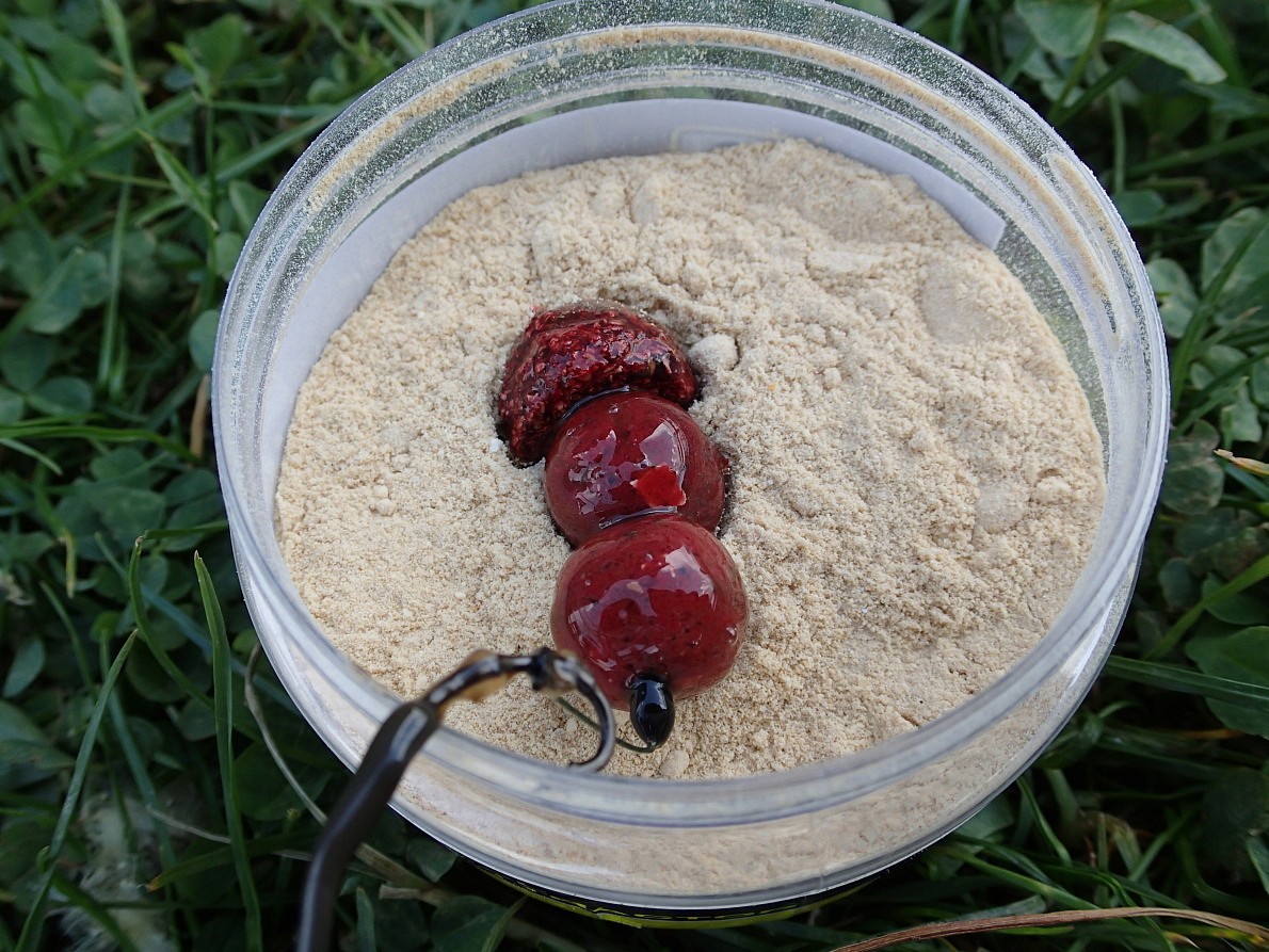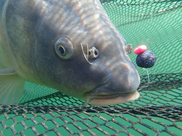 Takže znovu do člunu a úspěšnou Cherry s kuličkovkou a plovkou téže příchutě znovu odvézt do boje. Během dalších dvou hodin jsme se vyhřívali ve slunečních paprscích, které už nepálily tak jako předchozí den a nasávali atmosféru. Pak se jak jinak, než Pepovi, rozjel pravý prut a to zrovna ve chvíli, kdy se zvedl z křesla a šel se podívat k prutům. Škoda, že jsem neměl v ruce foťák, tohle vážně stálo za zachycení na video. Opět na člun a valíme za kaprem, který si taky slušně bral. Tentokrát se šňůry nepodařilo zamotat a kapra bez problémů dojíždíme. V okamžiku, kdy se na cívce navijáku objevilo pár otoček silného monofilu jako poslední části sestavy před gumičkou s kamenem, špička prutu se uctivě sklání k hladině a začíná tuhý boj. Na ohnuté špičce prutu vidím několikeré škubnutí, které ale vypadá zcela jinak, než když se menší kapři škubáním hlavou snaží zbavit montáže. Po chvíli to parťák potvrzuje hláškou „ ten je slušnej“, když v polarizačkách ze stoje ve člunu zahlédne šupíka ve větší hloubce u lodi. Tohle jsou ty chvíle, proč nás to tolik baví, absolutně nesdělitelné pocity štěstí, adrenalinu... Vrátím se ale ke zdolávání – to se v závěrečné části poměrně zkomplikovalo, neboť Pepa naštvaně hlásí „ ten je natvrdo“. Hrozí, že dnes už druhou slušnou rybu ztratí a to mu na klidu rozhodně nepřidá. Snažím se zachovat klidnou hlavu a objíždím v kruhu místo vázky. Toto se nám v minulosti již několikráte osvědčilo, tentokrát to však nepomáhá, a tak ke slovu přichází Pepova svépomocí vyrobená kotvička. S její pomocí se na několikátý pokus daří rybu z vázky vyprostit a zdolávání může pokračovat do zdárného konce. Kapra nakonec podebíráme ve vlnách sfouknutí blízko protějšího břehu, protože kotvičkovat se zapnutým motorem prostě nešlo a stejně tak se mi nedařilo ani veslovat s jeho prutem v ruce. Parťákova radost je očividná, 84cm a 11,7kg si tak připisuje na svou úlovkovou listinu. Nádherně tmavý šupík si „zobl“ v našem slangu „ Pepínova sněhuláka“. Vysvětlím hned – jedná se o kuličku Anglické jahody seřízlou ze dvou stran a dvě kuličky ananasu NBA, seřízlého z jedné strany. Jahoda je tedy vložena mezi dva ananasy a celé to vzdáleně připomíná hamburger, jen v poněkud bizarním, leč účinném provedení. Celé se to dá ještě vylepšit nanesením slabé vrstvy obalovací pasty Rapid Ananas NBA či Anglická jahoda nebo jich kombinací. Ta mezi styčnými plochami seřízlého boilies vydrží dost dlouho a zesiluje signál už tak atraktivního boilies. Pepa rozhodně doporučuje vyzkoušet.