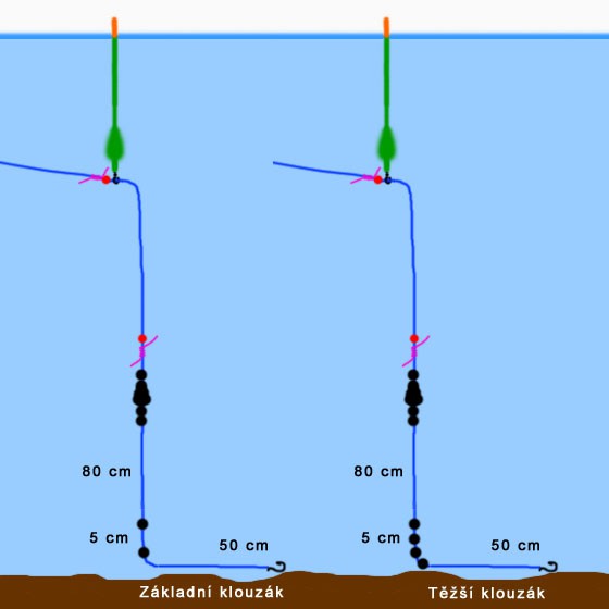 Na obrázku je dobře patrná konstrukce udice pro lov cejnů na klouzák (první v pořadí). Bročky, které jsou těsně nade dnem, přesně, citlivě a přitom velmi výrazně signalizují zvedáky. Torpila je dosti vysoko, protože jejím jediným úkolem je stáhnout vlasec očkem angličáku ke dnu. Její velikost se volí podle hloubky, ale bývá nejčastěji kolem 3 gramů. Pokud je zapotřebí ještě výraznějších záběrů, není nic jednoduššího než přidat další broky k návazci a vytvořit udici druhou. Tu používám hlavně při velkých vlnách, kde nejsou malé zvedáky dobře vidět.