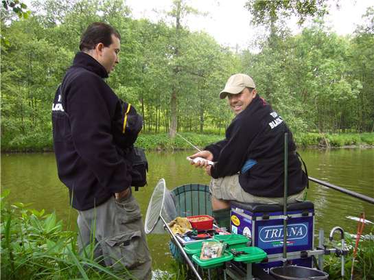 Nechávám čmeláka čmelákem a hňácám dvacet drobných kuliček, které se chystám naházet do vody. Na zbytek závodů si v kýbli nechávám jen trochu krmení víceméně na obalení lepených červů. Jedenáctá hodina se kvapem blíží a já zjišťuji, že ve srovnání s včerejškem nejsem vůbec nervózní. Může zato možná počasí, které se postupně vybírá a vypadá to na krásný den (až na ten vítr), ale spíš mě dostal do pohody vedlesedící Luboš, s kterým jsme ve verbálním styku prakticky neustále a hecování nabírá na obrátkách, zvlášť když zjišťujeme, že naše týmy od sebe aktuálně dělí v tabulce jen dva body.