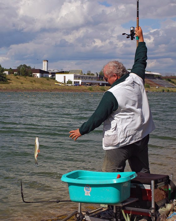 Stanovit taktiku pro sobotní závod nebylo jednoduché. Trénink mnoho věcí neukázal a spíše vyvolal řadu otázek. A tak se na břehu míchalo nejrůznější krmení, připravovali živé nástrahy od patentek, přes červy až po hnojáky. Přišlo losování, rozjeli jsem se na místa a čekali na první signál, který odstartuje první mistrovský závod. Netrvalo dlouho a vše se rozjelo na plné obrátky. Závodníci rozestavovali sedačky, vybalovali odhozové pruty a pak to nejdůležitější, přesně naměřit hloubku. V silném větru, který celý páteční i sobotní den foukal to nebylo jednoduché. Zkušení závodníci si s tím jistě poradili. Nakonec se na mém sektoru A objevila i jedna dělička. Přišel další signál a vodu začali bombardovat koule s krmením. Málo kdo se v silném větru odvážil až k lanům, která byla stažena odhaduji přes 50 metrů od břehu. Na sektorech kde se mnoho nelovilo to však byla snad jediná šance na ulovení více ryb. To co přišlo po dalším signálu čekalo jen málo závodníků. Na sektoru A a B se ryba prakticky nelovila (až na krajní pozice). Marně jsme se snažili přemluvit nějakou rybku k záběru. Za chvilku přišli zprávy, kde ryby jsou. Na sektoru D a polovině sektoru C se chytalo veliké množství ryb.