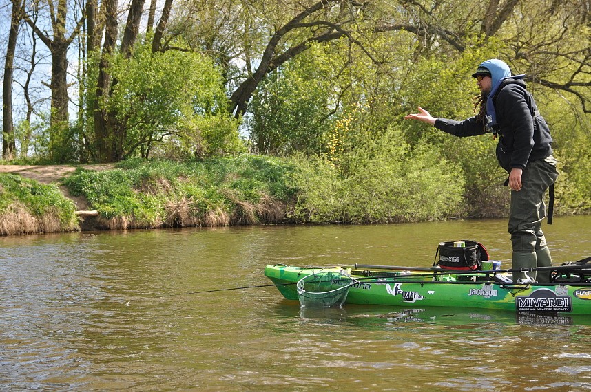 Výběr místa pro lov z kajaku na velké řece je dobré nepodcenit. Ryby se v tomto období připravují ke tření a postupně vyjíždějí proti proudu do mělčích a proudnějších partií. Na jaře tedy raději chytám v relativní blízkosti jezů, avšak ne příliš blízko, protože kotvení ve velkém proudu na kajaku je poměrně specifické a trochu i nebezpečné díky možným plovoucím předmětům po hladině, které by se mohli zamotat do kotevního lana a převrátit nás. Ideální partie řeky je pro mě okolo 500m až kilometru od jezu. Echolotem si najdu buď koryto řeky, kudy ryby proplouvají, a nebo hlubší úseky kolem zatopených keřů a padlých stromů, kde se rády zdržují. Důležité je dbát také na to, abychom našli relativně rovný úsek bez vázek na dně. Alfou a omegou úspěšného lovu je dobré zakotvení, protože budeme vnadit kousek od lodě a není nic horšího, než když se vám kotva uvolní. Potom je prakticky nemožné se znovu zakotvit do stejného místa. Pro bezpečné zakotvení je potřeba mít na kajaku udělanou trolejku s karabinou, do které připneme kotevní lano, které je možné v případě potřeby kdykoli uvolnit a nechat kotvu na místě. Samozřejmě musíme mít konec kotevního lana opatřen např. plovoucí pěnou. Pro kotvení v proudu je potřeba klasická kotva o minimální hmotnosti 2,5kg, klidně i více. Dle typu dna je potřeba kotvu na dně zaseknout, aby vás proud, vlny nebo vítr neodkotvili. Při poslední vycházce v silném protivětru bylo nutné použít kotvy dvě, jednu klasicky za záď a druhou do přední poloviny, aby nás vítr netočil proti proudu. Takto zakotvený je potom možné lovit, pokud to loď dovolí, i ze stoje.