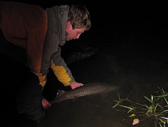 Co nevidět už se stmívá a tak se připravujeme na noc. Rozděláváme si oheň a spokojeně sedíme u tepla a čekáme na záběr. Dočkal jsem se, druhý záběr je tu. Zaseknu, ale zdá se mi, že na háčku nic není. Po chvilce však cítím odpor a ryba se rozjíždí na druhou stranu. Po zdolání se mohu vyfotit s mým prvním jeseterem. Měří 88 cm a váží 5 kg.